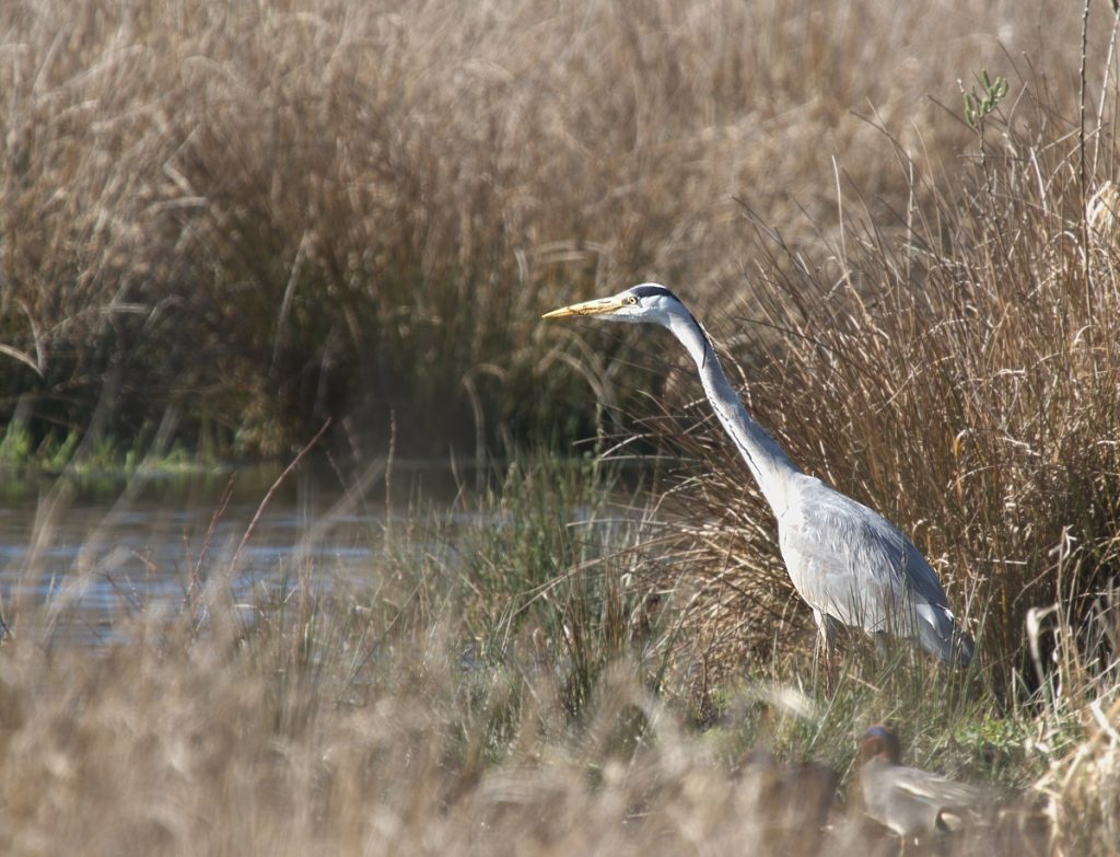 Erst auf dem Monitor habe ich gesehen, dass vor dem Reiher eine Krickente (Erpel) gut getarnt sitzt.