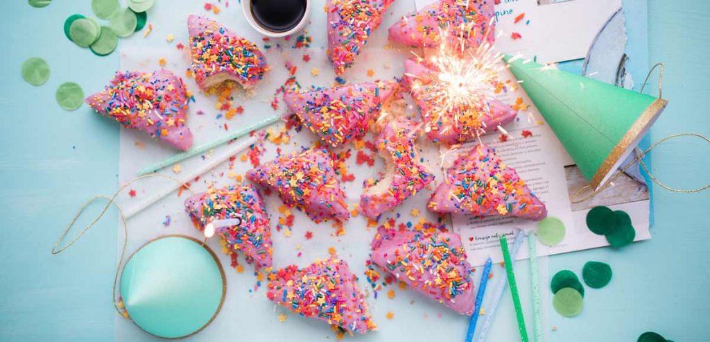 Mit Luftballons und Kuchen bunt,